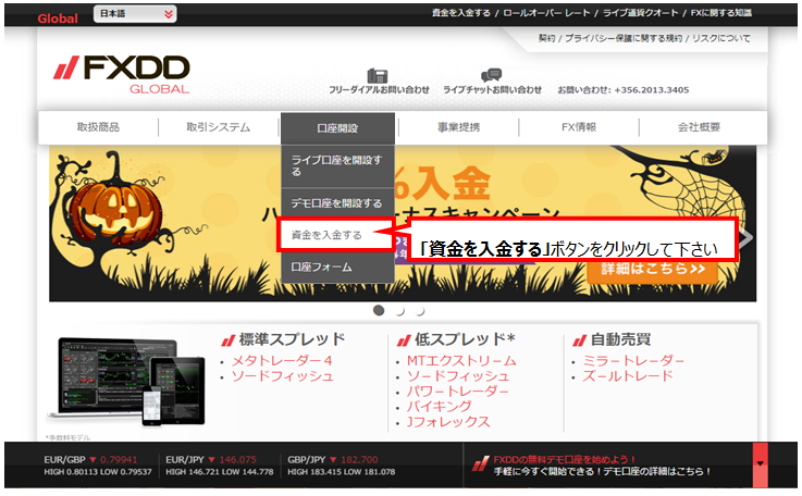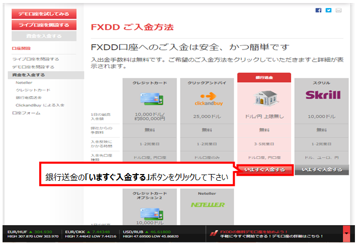 FXDDでは、取引口座へ豊富な入金方法を提供します。 「クレジット・デビットカード」、「クリックアンバイ」、「マネーブッカーズ」、「ネッテラー」、「国内銀行送金」、「海外送金」 のご利用が可能です。ご利用方法