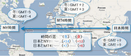 上記の図をご参考ください。日本は夏時間のときMT4の時間より6時間進んで、冬時間の場合は7時間進んでいます。従って、MT4時間に変えるときはその時間を引いて計算してください。