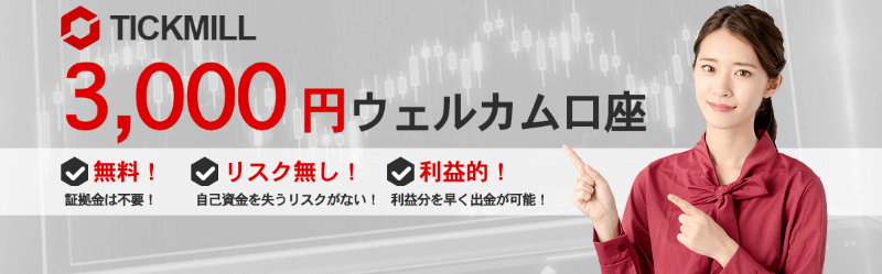 TICKMILL (ティックミル) 3,000円ウェルカム口座キャンペーンは、全ての新規のお客様が完全にリスク無しで自己分の取引証拠金を預金することなく、取引環境を体験し、お取引いただく機会です。全て得られた利益はお客様のものとなり、すぐに出金いただくことも可能です!