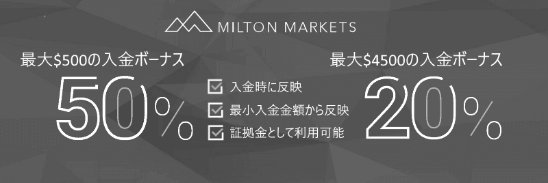 【Milton Markets】50%と20%の入金ボーナス(最大総計額50万円)