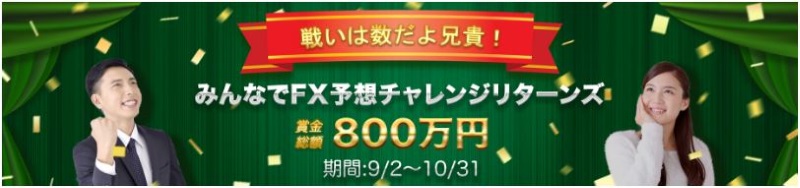 取引口座にて9月2日から10月31日(NY時間)のキャンペーン期間中にトレードすると、毎週行われるFX予想チャレンジの参加権を獲得できます。FX予想チャレンジでは週末のドル円レートなどを予想していただき、予想が当たると最大100万円のビッグな賞金とボーナスが正解者に分配されます。