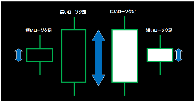 取引するときに、長いローソク足と短いローソク足など様々なサイズのものがあることに気づくでしょう。長いローソク足は売買が強いことを表します。ローソク足が長いほど、売買がより強く、終値が始値からの差が大きくなります。