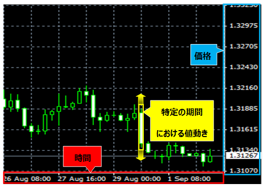 以下は、MT4チャートの典型的なイメージです。MT4取引プラットフォームを使用するすべてのFXトレーダーが同一の市場データをモニターしています。このグラフでは、上下に移動する緑のグラフとそれにつれて変化を起こす為替相場を注意深く見ていきます。では、より詳しく以下のMT4チャートを見てみましょう。青色で強調表示された領域(縦軸)は、通貨価格を表示します。下チャート、EUR/USDのレートを例にしています。赤色で強調表示された 領域(横軸)は時間を表示し、黄色で強調表示された領域は特定の期間における値動きを表します。