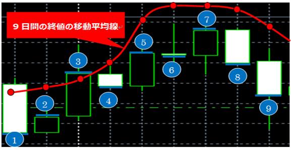 以下の例では、9日間の移動平均線を詳しく見てみましょう。