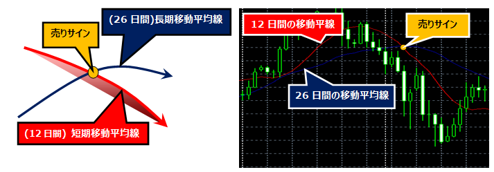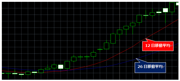 トレーダーは、トレンドをより正確に予測するために、少なくとも2つの異なる期間の移動平均を参照します。例えば、12日間や26日間などの短期間移動平均と長期移動平均の両方を見比べて市場の予測をします。下の画像では、短期移動平均線(12日移動平均)が長期移動平均線(26日移動平均)に比べて、価格変動に急速に反応していることが分かります。長期移動平均は、より長期にわたって平均値を計算するので長期的な市場動向を分析するにはより信頼性があると考えられています。