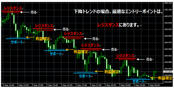 下降トレンドの場合、トレーダーはレジスタンスレベルで売り、次のサポートレベルで利益を確定することを目指します。下降トレンドの場合、トレーダーは、重要なレジスタンスレベル、またはその近くで市場へ参入することで、取引リスクを減らし取引の機会を向上させることができます。