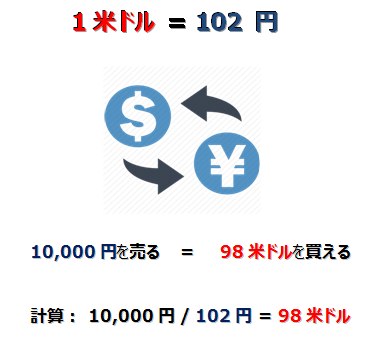 102 円を両替するごとに1米ドルを受け取ります。そうすると、例えばアメリカに旅行をする際、一万円(10,000円)を両替すれば、98米ドルを受け取ることができます。