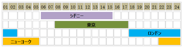 現在、為替市場の主要な取引時間帯には、シドニー、東京、ロンドン及びニューヨークの4つのセッションがあげられます。セッションとは、事前にオファーされた為替レートでの取引可能な時間帯を意味します。これらの4都市がアジア、北米、欧州各地域の主要な金融センターの代表であるため各セッションにはこれらの都市名が使用されます。
