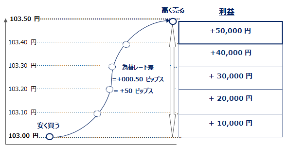 例 – USD/ JPY 1ロット103.00円で買って103.50円で売る場合