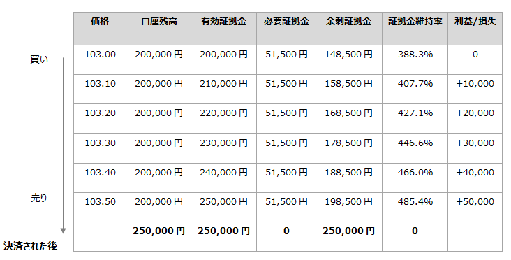 (表1)の例では、円相場が103.00から103.10になった時、有効証拠金は増加しています。