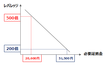 また、レバレッジを増やすことで必要証拠金は少なくなっています。つまり レバレッジと必要証拠金の間で反比例関係が存在していることがわかります。一方で、レバレッジを下がると、取引当たりの必要証拠金は増加することになります。