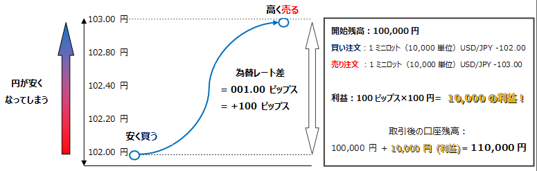 あるトレーダーが、取引口座に10万円を入金し、102.00円でUSD/JPYの標準ロットを1ロット(100,000通貨単位)買ったとします。その後、103.00円で売ると、001.00ピップス(+100ピップス)の利益を得ることになります。
