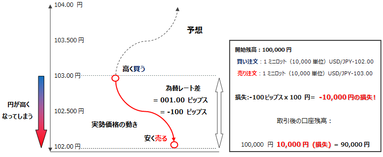 この場合、ピップス(-100 ピップス)の損失が出ることになります。トレーダーはUSD/JPYの1ミニロットを高い価格で買って、価格が下がってしまったとき売ったので、10,000円の損失をしたということになります。