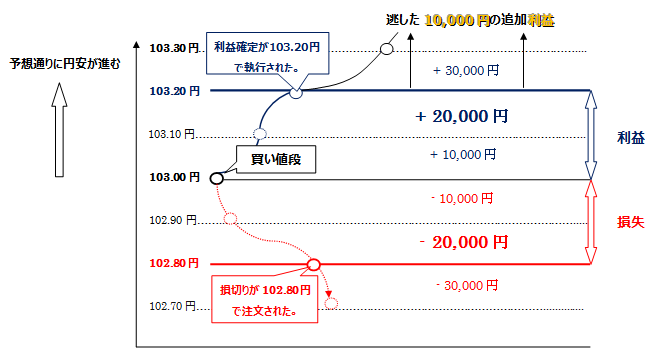 しかし、以下の図表を見ると、円安はさらに続き、利益確定レベル(103.20円)を超えて円相場は103.30円になりました。利益確定レベルは103.20円で自動決済されているので、トレーダーが10,000円の追加利益を逃すことになりました。もし、取引が決済されていない場合、または利益確定レベルがもっと高かった場合、10,000円の追加の利益を得ていたことになります。