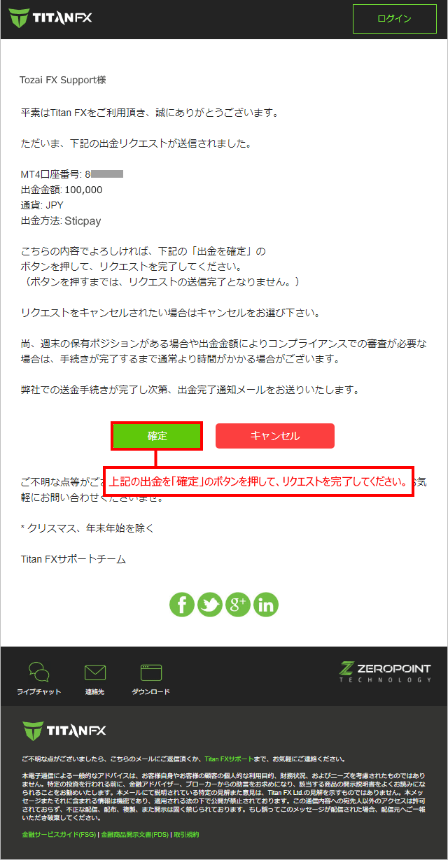 こちらの出金内容でよろしければ、緑色の出金を「確定」ボタンを押して、出金リクエストを完了してください。