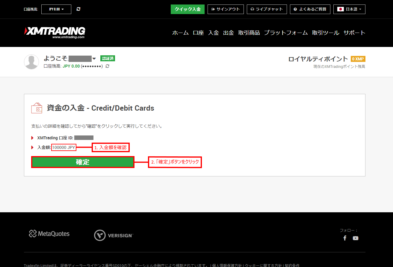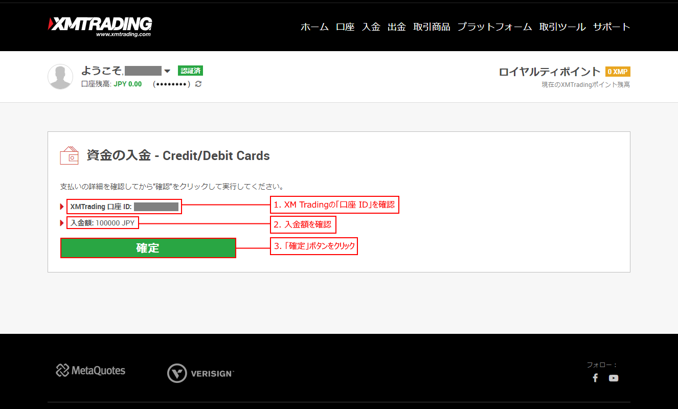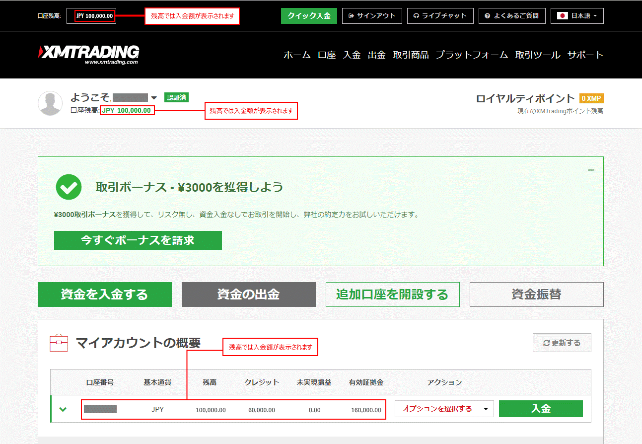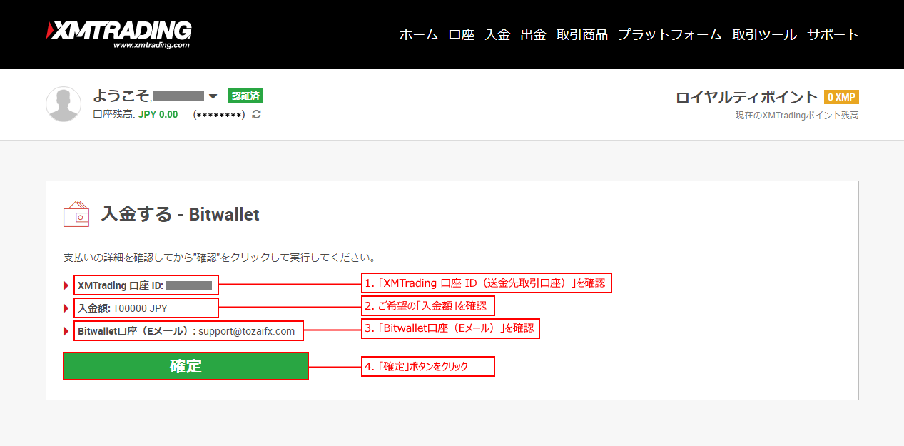 入金額は取引口座に規定された時間枠内で(即時。しかし、お客様の金融機関によって約24時間が掛かる場合がございます。)反映されていない場合は、XMトレーディング(support@xmtrading.com)の日本語サポートへお問い合わせください。