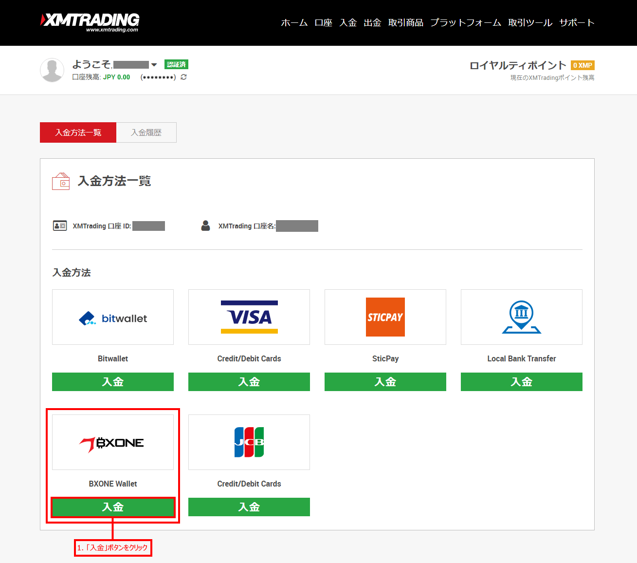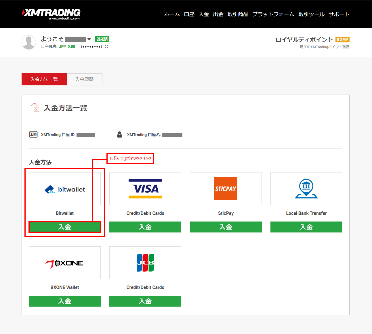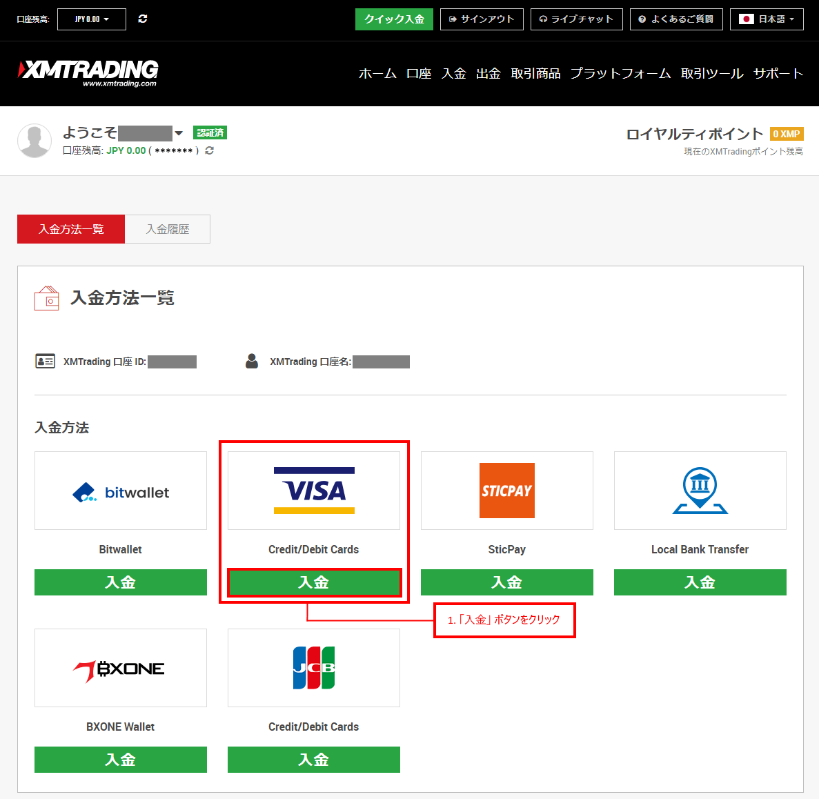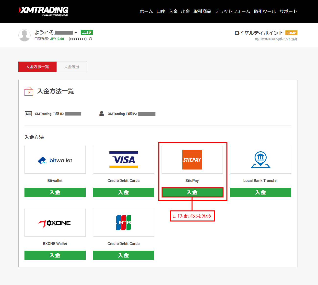 XMTradingの会員ページにログインした後、以下のイメージで示されているように、「入金」ボタンをクリックしてください。