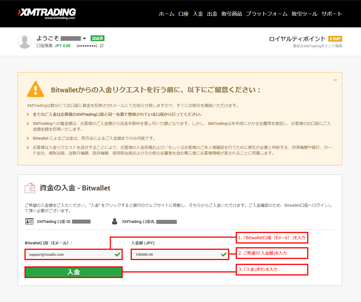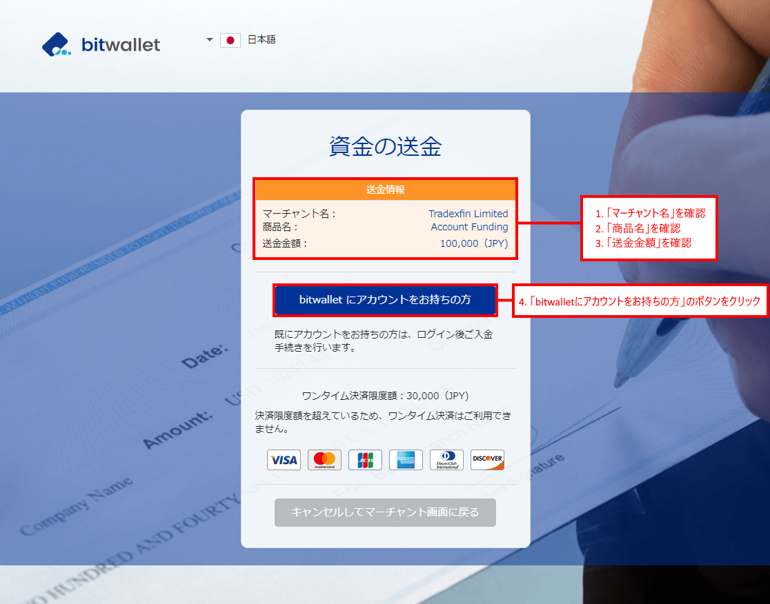 bitwallet(ビットウォレット)からの入金リクエストを行う前に、以下にご留意ください:
