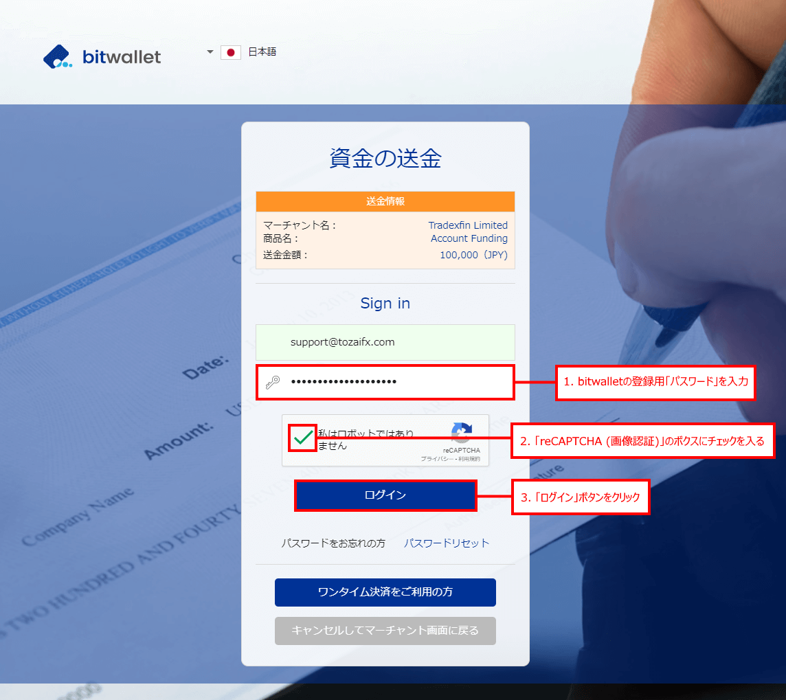 bitwalletの資金の送金画面では、bitwalletの登録用メールアドレスが自動的に表示されます。資金送金の続きに、bitwalletの登録用「パスワード」をご入力し、「reCAPTCHA (画像認証)」のボクスにチェックを入れて「ログイン」ボタンをクリックします。