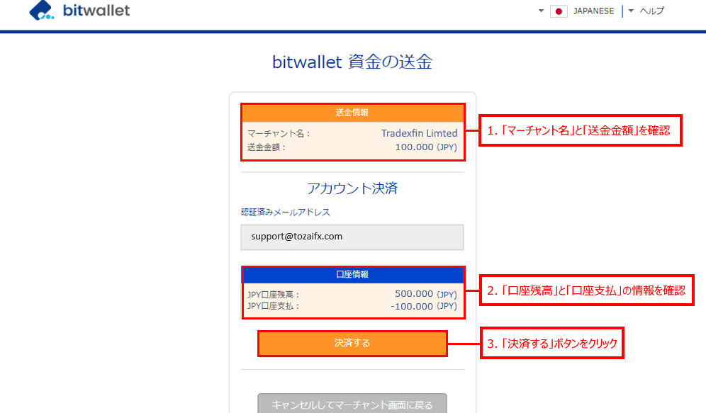 「ログイン」ボタンをクリックした後、bitwallet資金の送金を決済する画面に続きます。こちらの画面では、「マーチャント名」の欄に「Tradexfin Limted」と「送金金額」の欄にご希望の送金金額が表示されます。「口座情報」では、bitwalletの「口座残高」と「口座支払 (送金金額)」が表示されます。bItwalletによる送金手続きを完了には、「決済する」ボタンをク リックしてください。