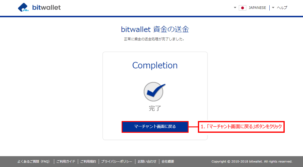 「決済する」ボタンをクリックした後、bitwalletによる送金手続き完了画面に進みます。こちらの画面が表示されましたら、送金手続きが完了となります。