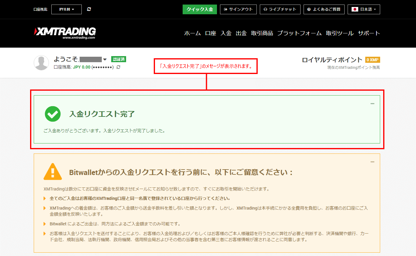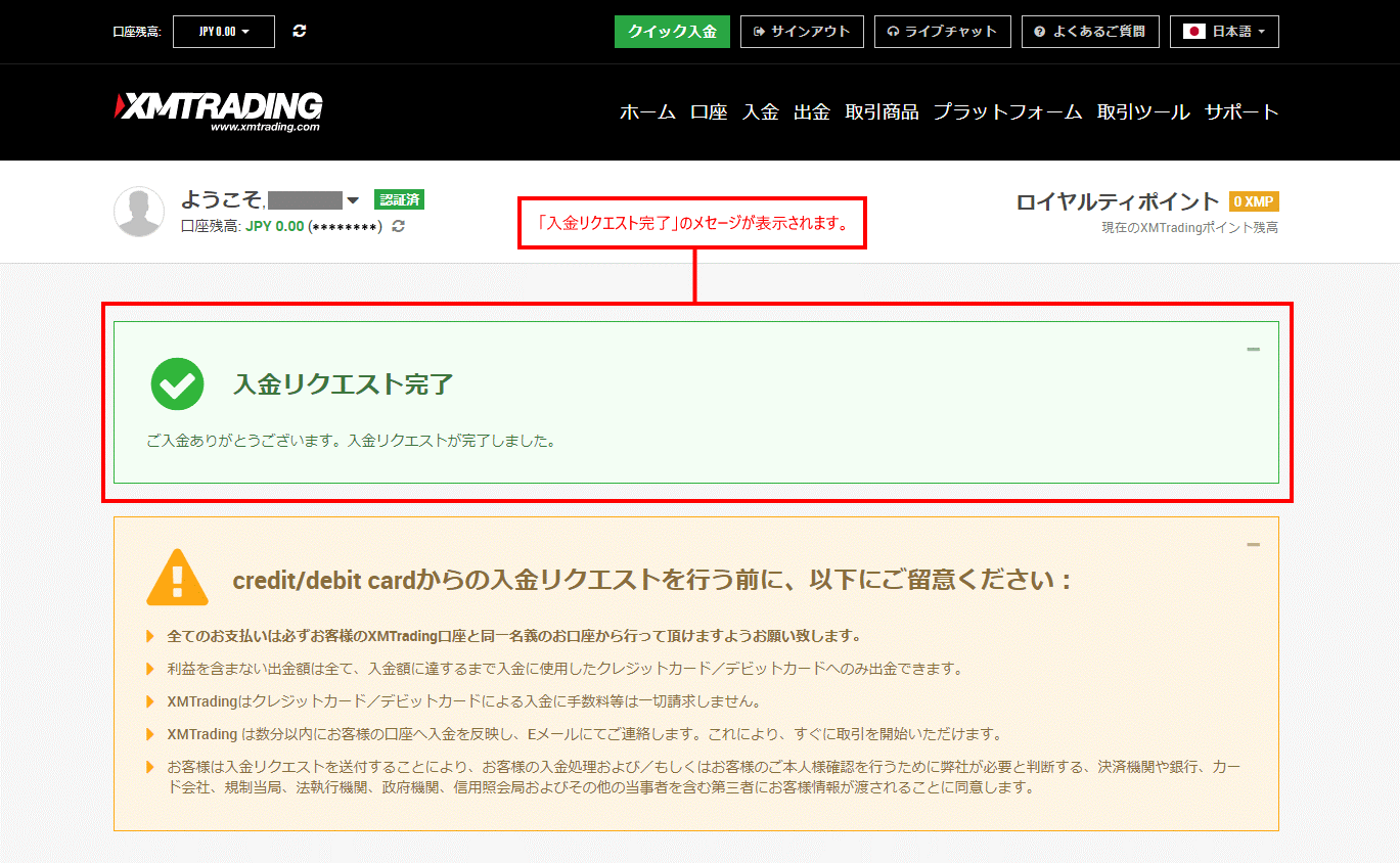 「入金」ボタンをクリックすると、お客様の会員ページに自動的に戻って、「入金リクエスト完了」の画面に進みます。こちらの画面では、「ご入金ありがとうございます。入金リクエストが完了しました。」という入金手続き完了のメセージが表示されます。「入金リクエスト完了」画面が表示されますと、クレジット・デビットカードでの入金手続きは完了です。