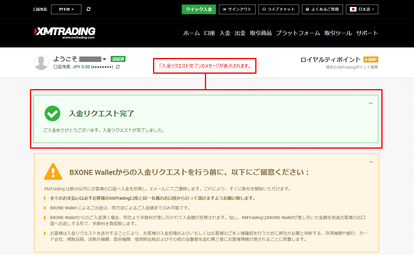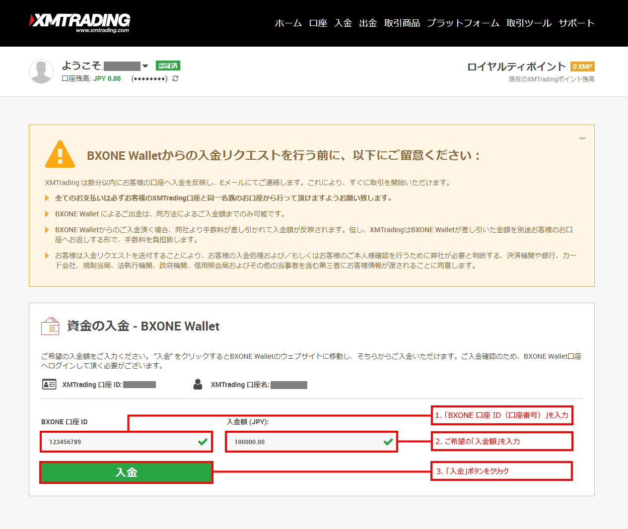 BXONE Walletからの入金リクエストを行う前に、以下にご留意ください: