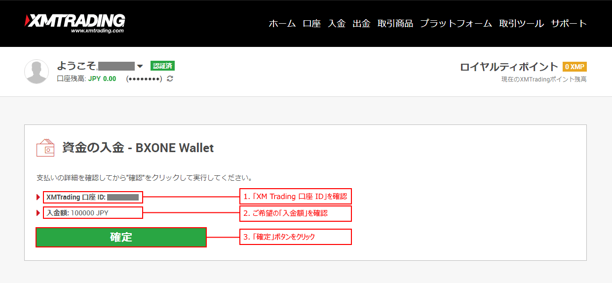 次にBXONEの支払いの詳細の確認画面に進みます。こちらの画面では、XM Tradingの「入金先の取引口座(口座ID)」およびご希望の「入金額」を確認します。問題なければ、「確定」ボタンをクリックして確定してください。
