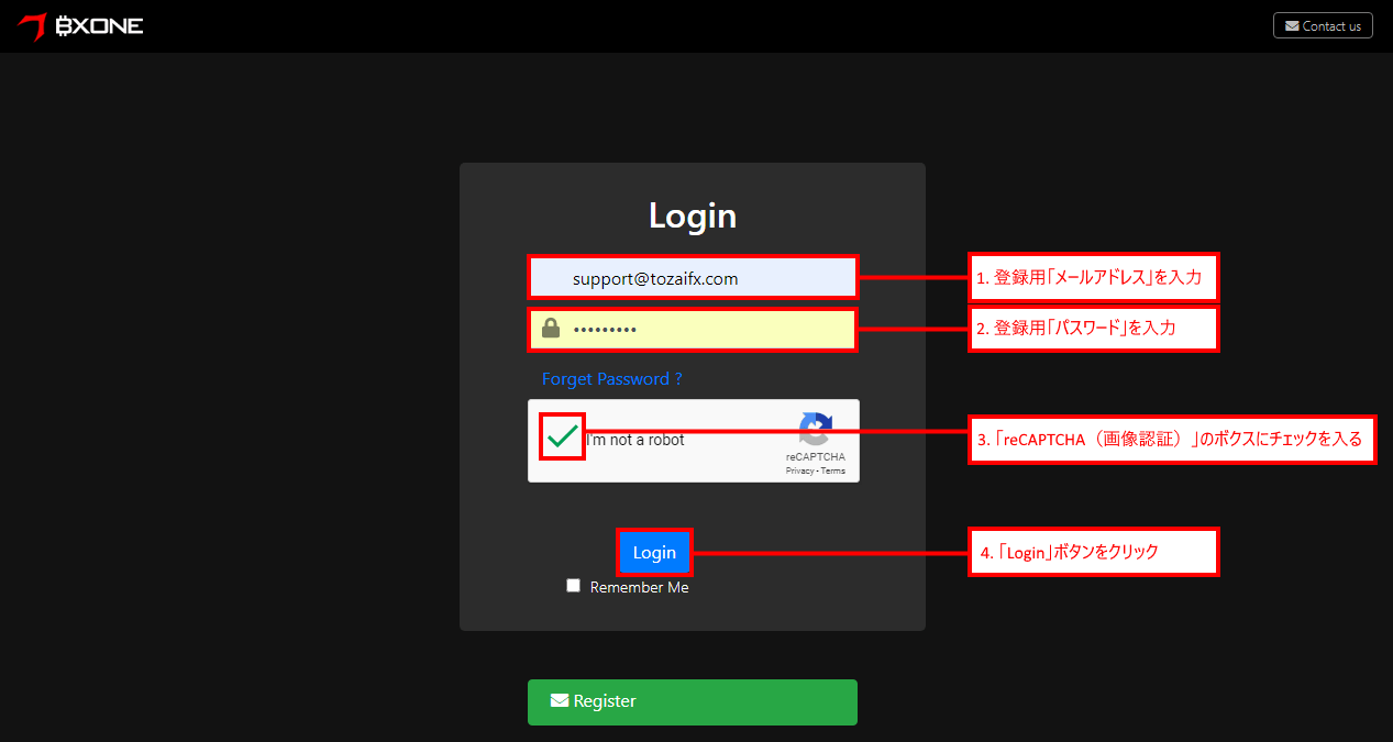 「確定」ボタンをクリックした後、BXONEウォレットのログイン画面に自動的に移転いたします。入金手続きを完了するには、BXONEの「登録用メールアドレス」および「パスワード」をご入力の上、「ログイン」ボタンをクリックしてください。