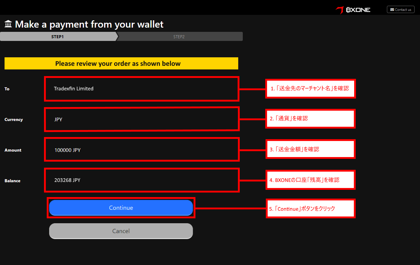 「ログイン」ボタンをクリックすると、BXONEウォレットの「支払い」画面に進みます。こちらの画面では、送金先のマーチャント名「Tradexfin Limited」、送金の「通貨」、「送金額」とBXONEウォレットの口座の「残高」が表示されます。BXONEウォレットによる送金手続きを完了には、「Continue」ボタンをクリックしてください。