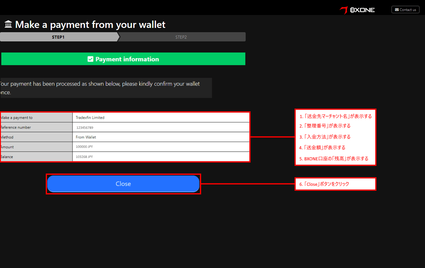「Continue」ボタンをクリックすると、BXONEによる送金手続き完了画面に進みます。こちらの画面が表示されましたら、送金手続きが完了となります。こちらの画面では、「送金先マーチャント名(Tradexfin)」、「整理番号」、「入金方法(From Wallet)」、「入金額」およびBXONE口座の「残高」が表示されます。