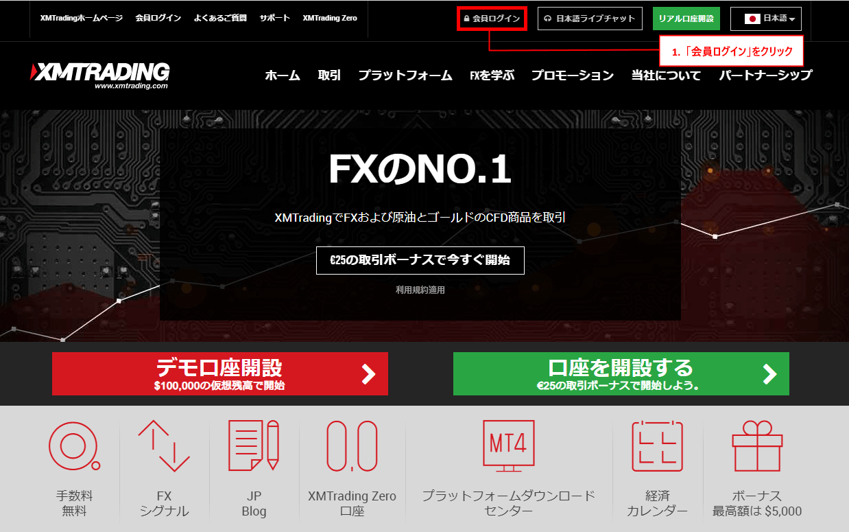 まず、XMトレーディングのホームページより、「会員ページ」にログインしてください。以下のイメージで示されているように「会員ログイン」ボタンをクリックしてください。