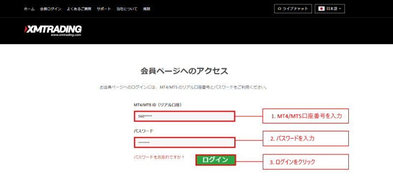 会員ページのログイン画面へ進んだ後、「MT4・MT5口座番号」や「パスワード」を入力し、「ログイン」ボタンをクリックしてください。