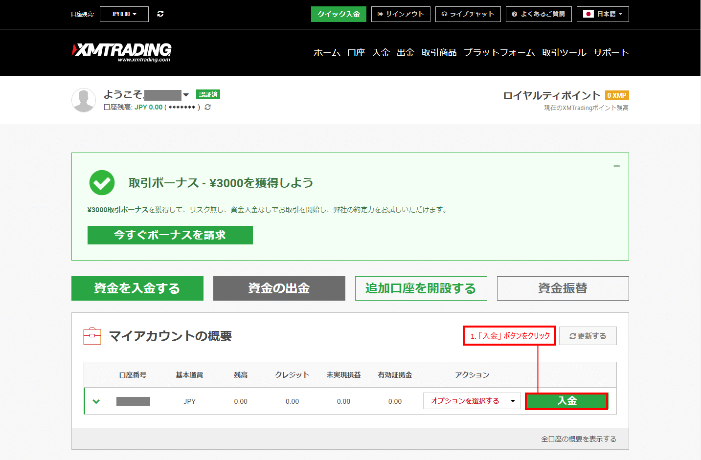 XMTrading(XM トレーディング)の会員ページにログインした後、以下のイメージで示されているように、「入金」ボタンをクリックしてください。