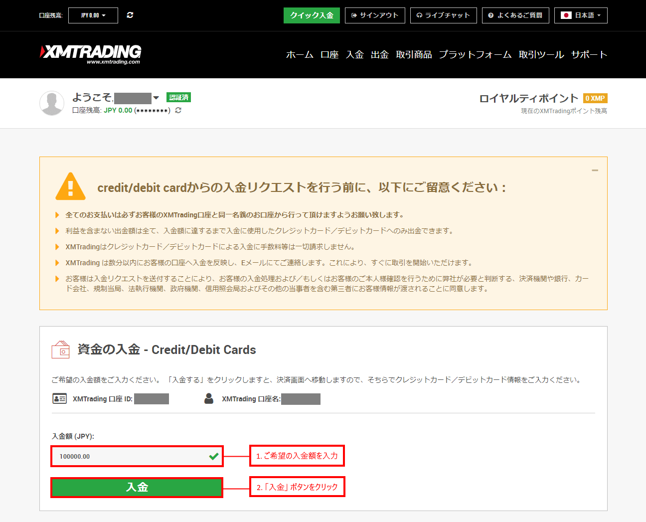 Credit/Debit cardからの入金リクエストを行う前に、以下にご留意ください:
