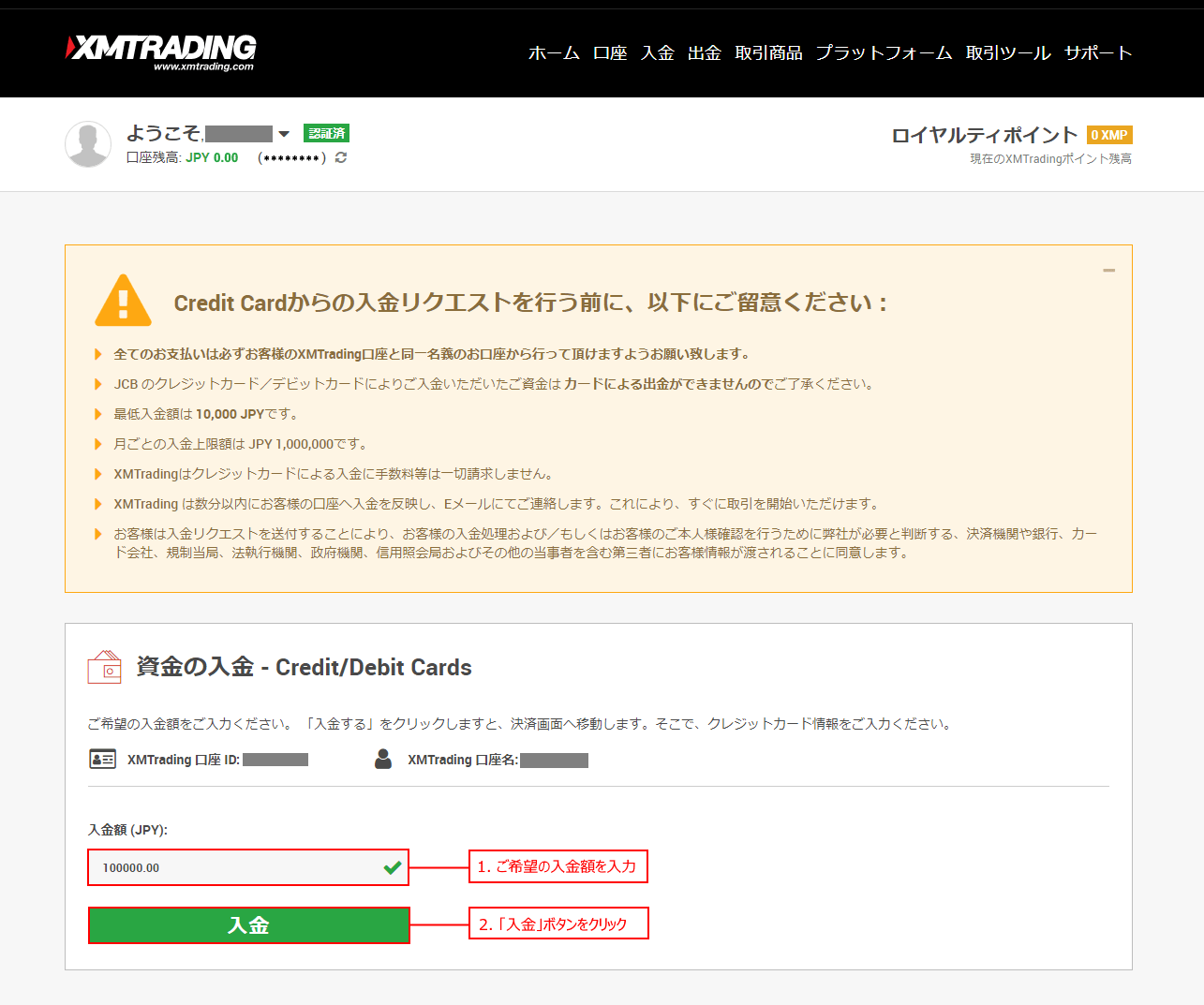 「入金」ボタンをクリックすると、「資金の入金 – Credit/Debit Cards」(クレジット/デビットカード)の画面が表示されます。次に、以下のイメージで示されているようにご希望の入金額を入力し、「入金」ボタンをクリックしてください。