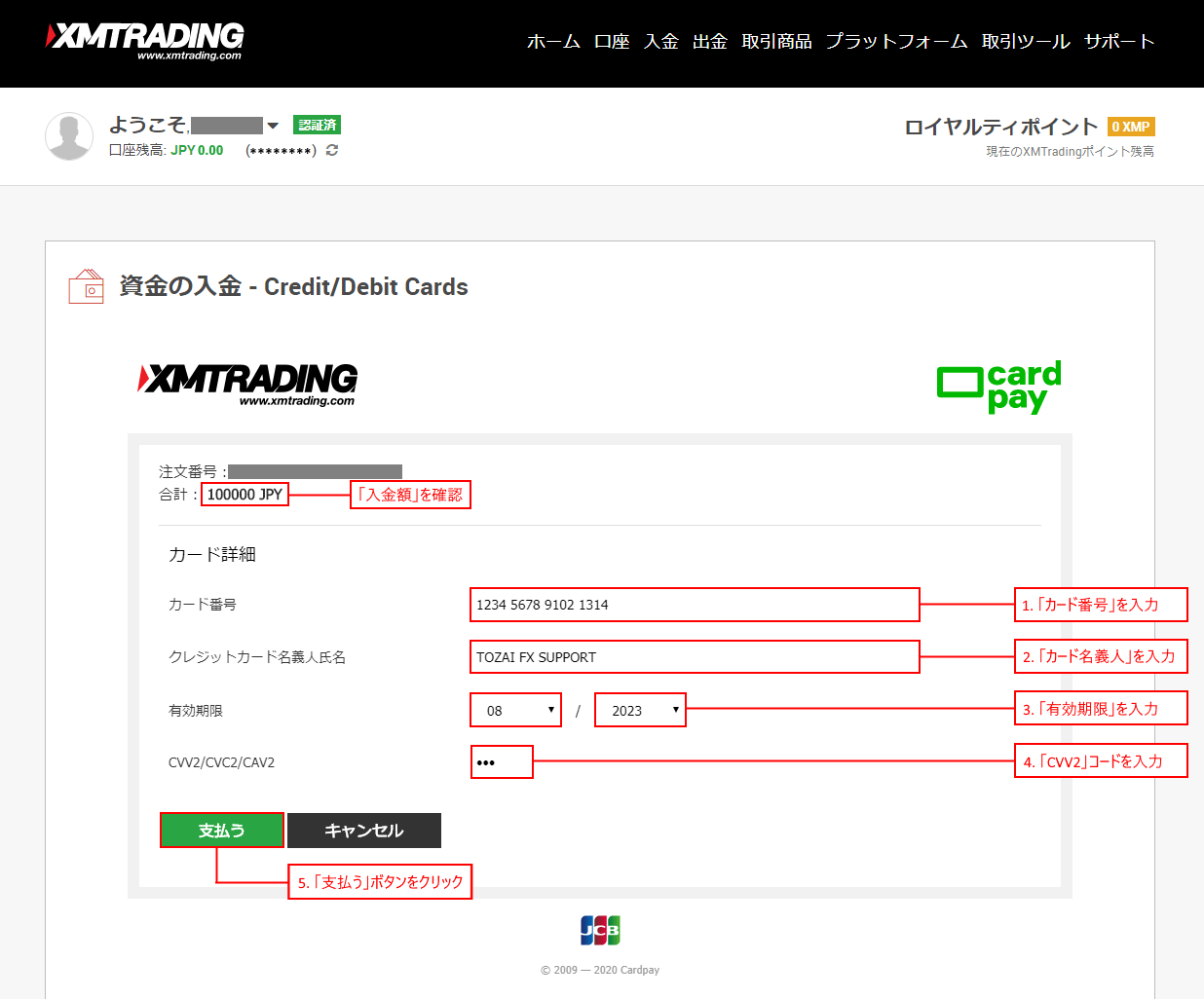 JCBカードからの入金リクエストを行う前に、以下にご留意ください: