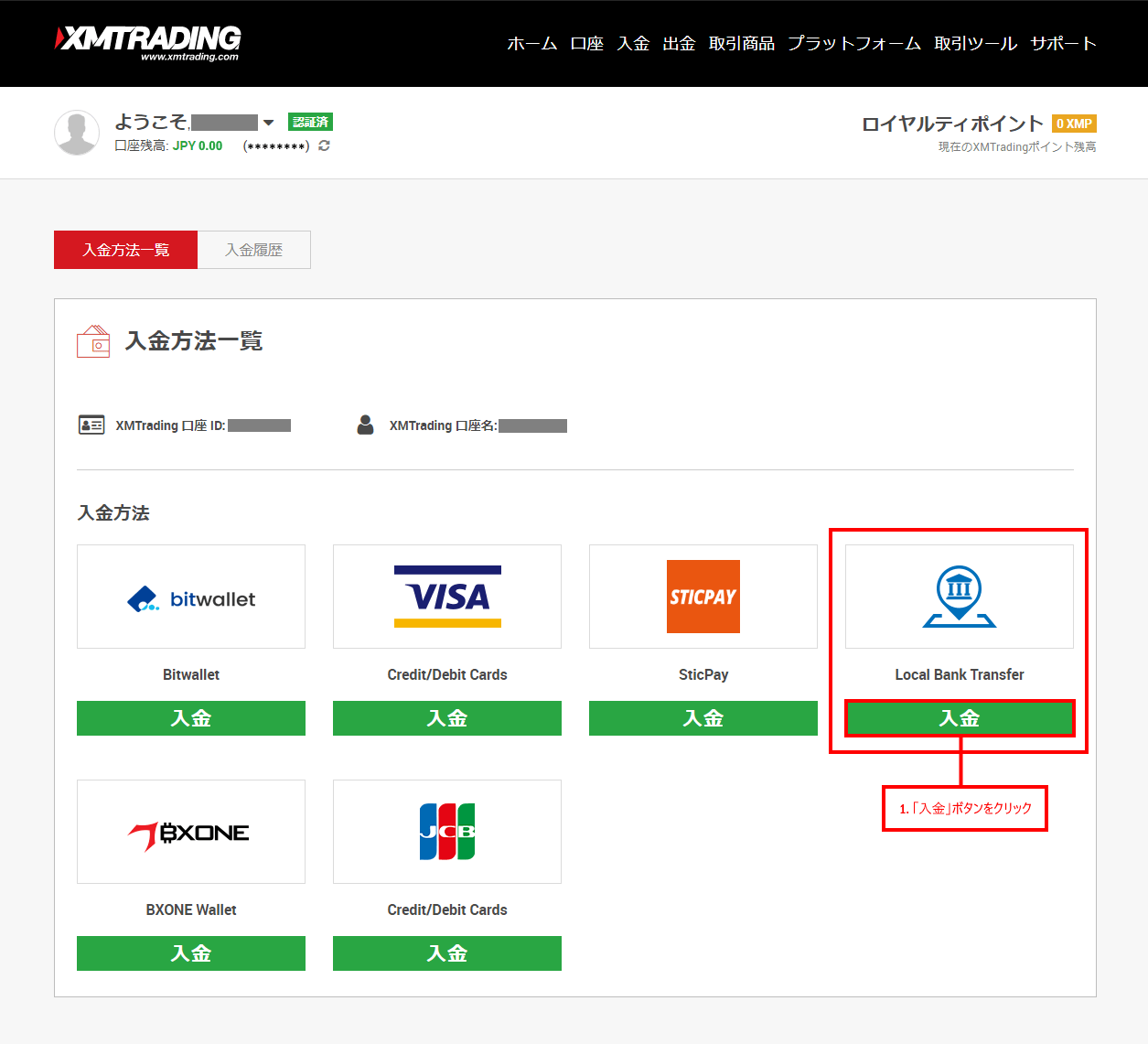 XMTradingの国内銀行送金サービス(楽天銀行)を経由して入金するためには、「Local Bank Transfer(国内銀行送金)」の「入金」ボタンをクリックしてください。