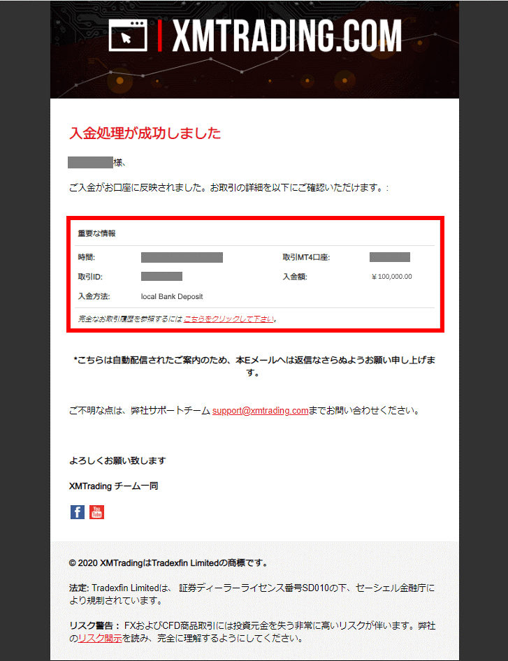 「Local Bank Deposit」というXMTradingの国内銀行送金サービスの入金方法によって入金手続き完了と同時に、お客様の登録されたメールアドレスに下記の「入金処理が成功しました」という件名の確認メールが届きます。こちらの確認メールは、ご入金について「時間」、「取引MT4口座」、「取引ID」、「入金額」、「入金方法」の「重要な情報」が記載されています。