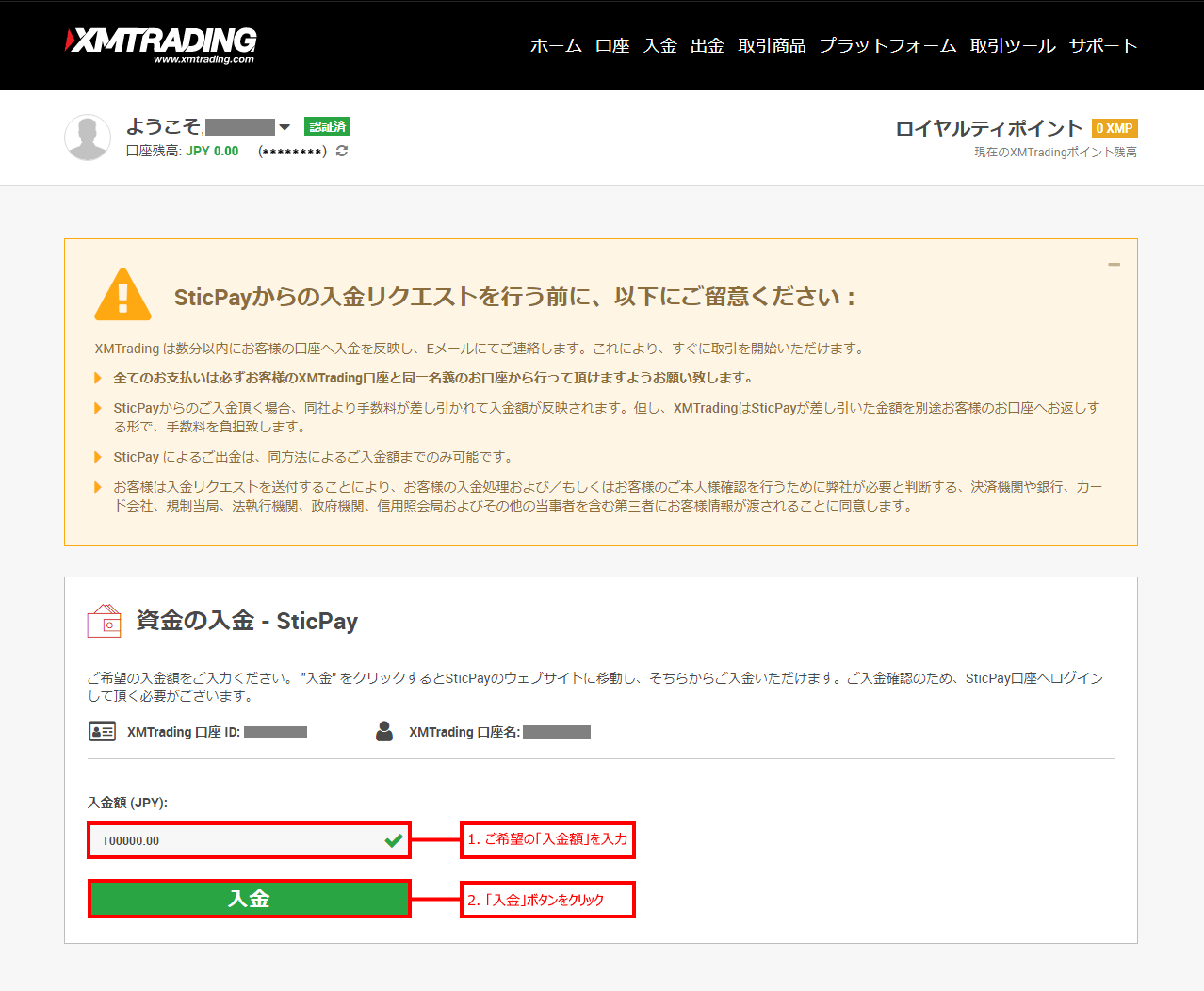 SticPayからの入金リクエストを行う前に、以下にご留意ください: