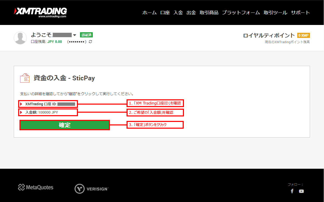 次にSTICPAY(スティックペイ)の支払いの詳細の確認画面に進みます。こちらの画面では、XM Tradingの「入金先の取引口座(口座ID)」およびご希望の「入金額」を確認します。問題なければ、「確定」ボタンをクリックして確定してください。