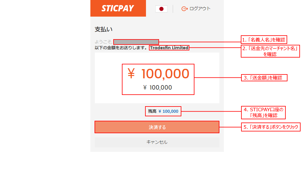 「ログイン」ボタンをクリックすると、STICPAY(スティックペイ)の「支払い」画面に進みます。こちらの画面では、STICPAYの口座の「名義人名」、送金先のマーチャント名「Tradexfin Limited」、「送金額」とSTICPAY口座の「残高」が表示されます。STICPAYによる送金手続きを完了には、「決済する」ボタンをクリックしてください。