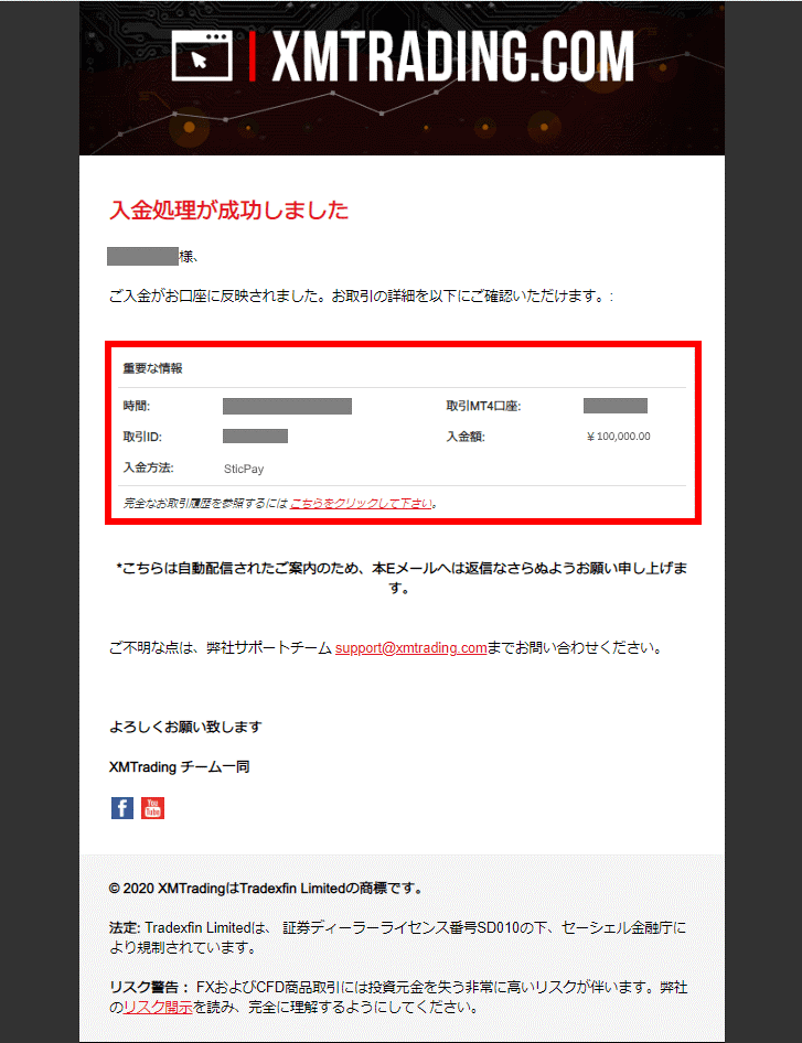 入金手続き完了と同時に、お客様の登録されたメールアドレスに下記の「入金処理が成功しました」という件名の確認メールが届きます。こちらの確認メールは、ご入金について「時間」、「取引MT4・MT5口座」、「取引ID」、「入金額」、「入金方法」の「重要な情報」が記載されています。